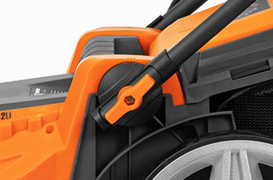 Рукоятка газонокосилки регулируется для выбора оптимальной высоты в зависимости от роста человека, использующего газонокосилку.